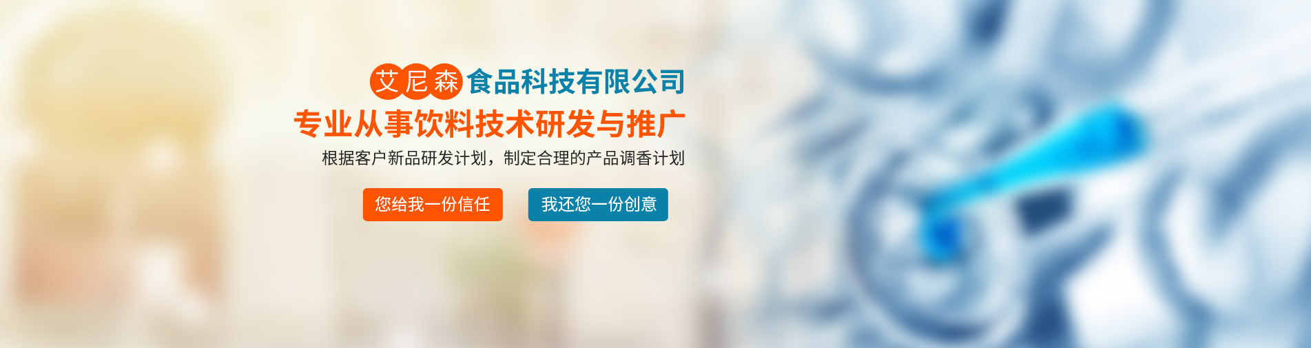 廊坊市艾尼森食品科技公司是一家專業(yè)從事飲料技術(shù)研發(fā)與推廣的公司,公司業(yè)務(wù)主要包括食品飲料技術(shù)咨詢與服務(wù)、產(chǎn)品定位與現(xiàn)有產(chǎn)品品質(zhì)改進、新產(chǎn)品技術(shù)工藝研發(fā)等。公司坐落于京津冀核心地帶--廊坊市,位置得天獨厚,現(xiàn)與京津多家研究所形成戰(zhàn)略合作關(guān)系,為多家上市公司及知名企業(yè)提供技術(shù)支持與原材料供應(yīng)。